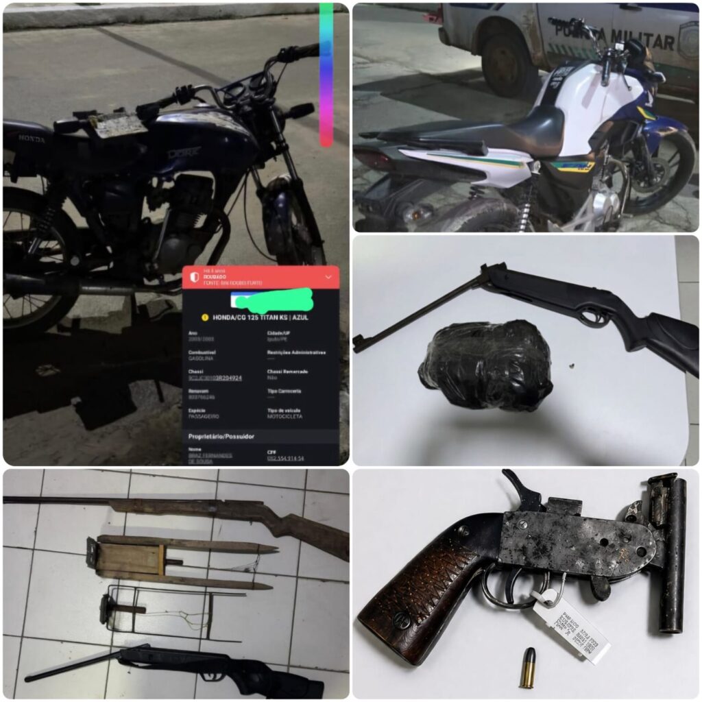 Também em Ouricuri, no povoado Cara Branca, policiais apreenderam um revólver calibre .22 com munição e recuperaram uma motocicleta com restrição de roubo/furto, após denúncia envolvendo oferta de arma de fogo por meio de redes sociais. Um menor entregou voluntariamente a arma ao efetivo, e o caso foi encaminhado para os procedimentos legais.